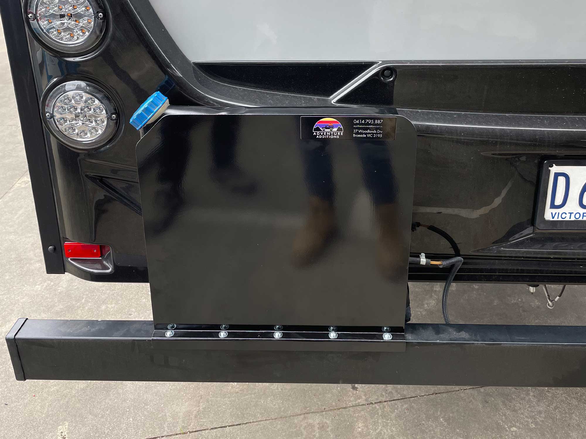The caravan had recently had a diesel heater installed. The diesel fuel tank was bolted to the rear bar of the caravan and created an eye sore. We sewed a black PVC cover for the tank and encased it with a custom-made bracket to protect it from the elements and damage.